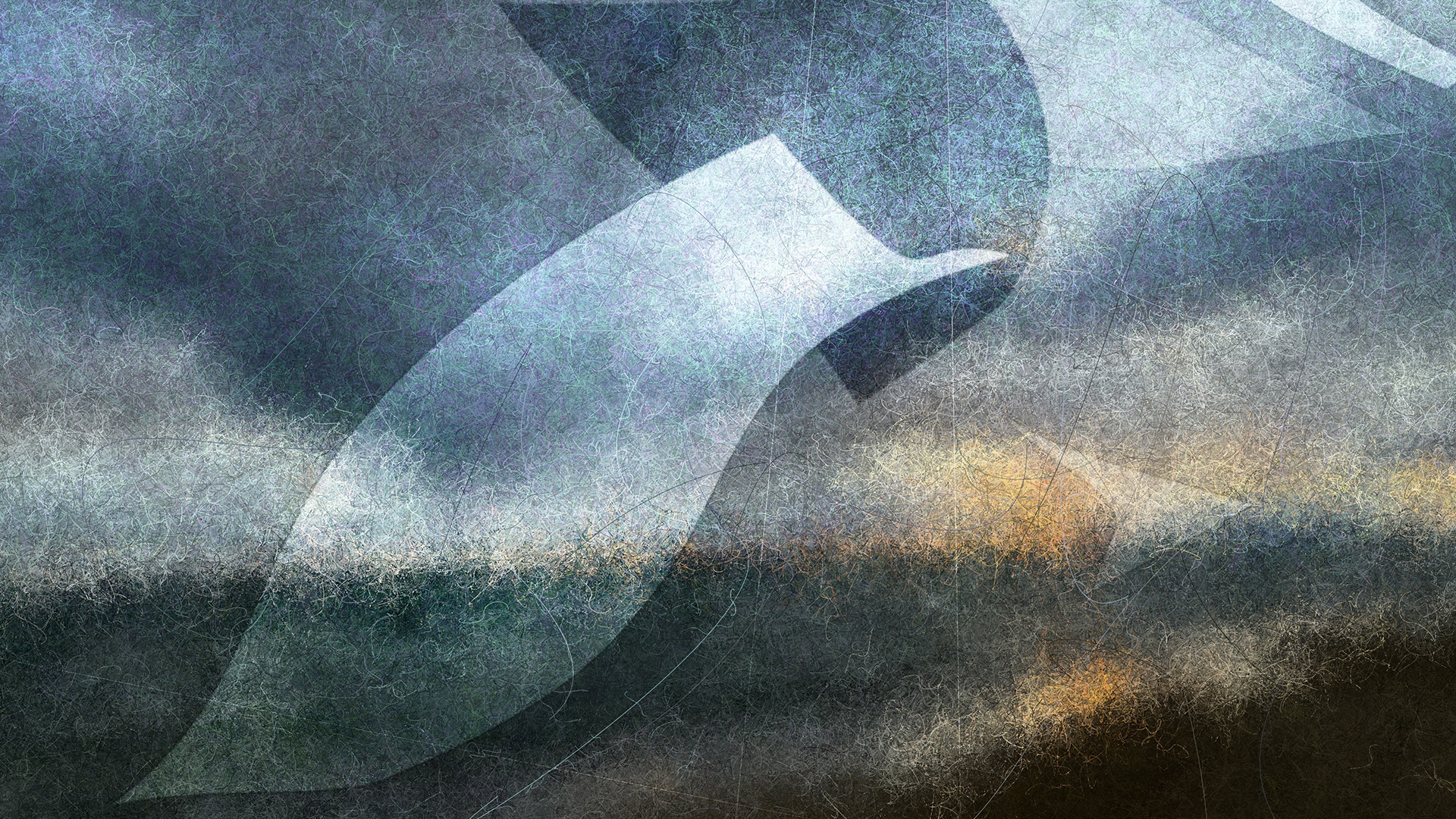 This piece is generated from a series of landscape photographs and 3D models. It appears to be a still image but it is constantly evolving at a piece just below human perceptual threshold. The computer creates an image by drawing shapes and lines based on a source landscape image. The resulting image becomes the source image for the next generation, so it gradually becomes more abstract over time. 3D models of windblown paper strips are laid over this evolving background. Everything is constantly changing and this piece will never exactly repeat itself.